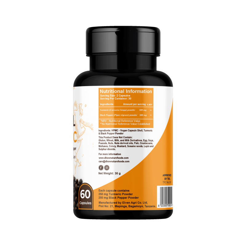 High Curcumin Turmeric is combined with Forest grown Black Pepper increases the bio availability by up to 2000%